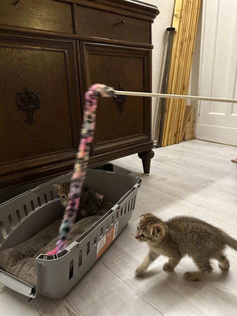 Sie mochten beide die Transportboxen nicht besonders gern, was sie durch miauen und Ausbruchsversuche kund taten. Zum Glück dauerte die Fahrt nur sehr kurz.